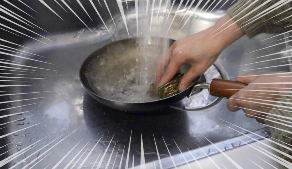 コーティングの剥離を気にする必要がなく、金属ヘラも使え、熱いまま水につけてジュっと冷ませて、ゴシゴシ洗える丈夫さがあります。